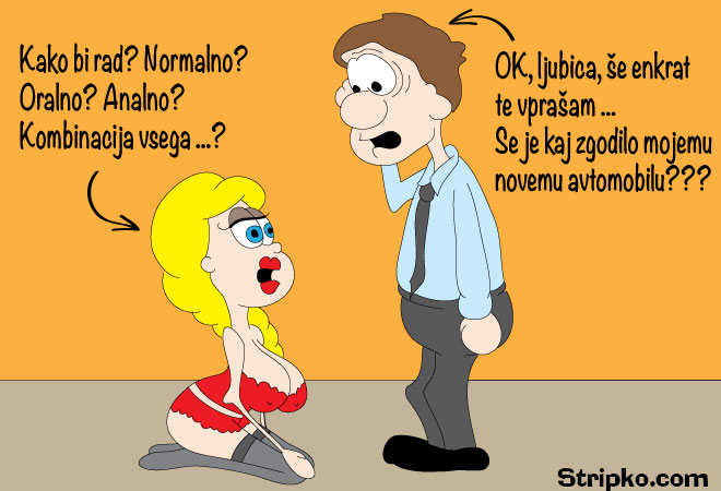 -“Kako bi rad? Normalno? Oralno? Analno? Kombinacija vsega…? OK, ljubica, še enkrat te vprašam… Se je kaj zgodilo mojemu novemu avtomobilu???”