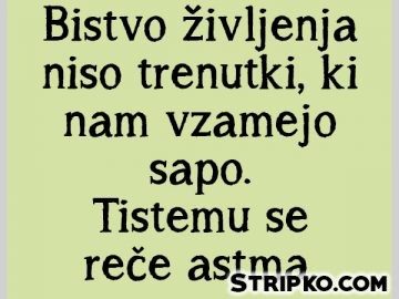 140 Sarkazembistvo življenja, sarkazem, satmaBistvo življenjaBistvo življenja niso trenutki, ki nam vzamejo sapo. Tistemu se reče astma. by Stripko 4 leta ago4 leta ago